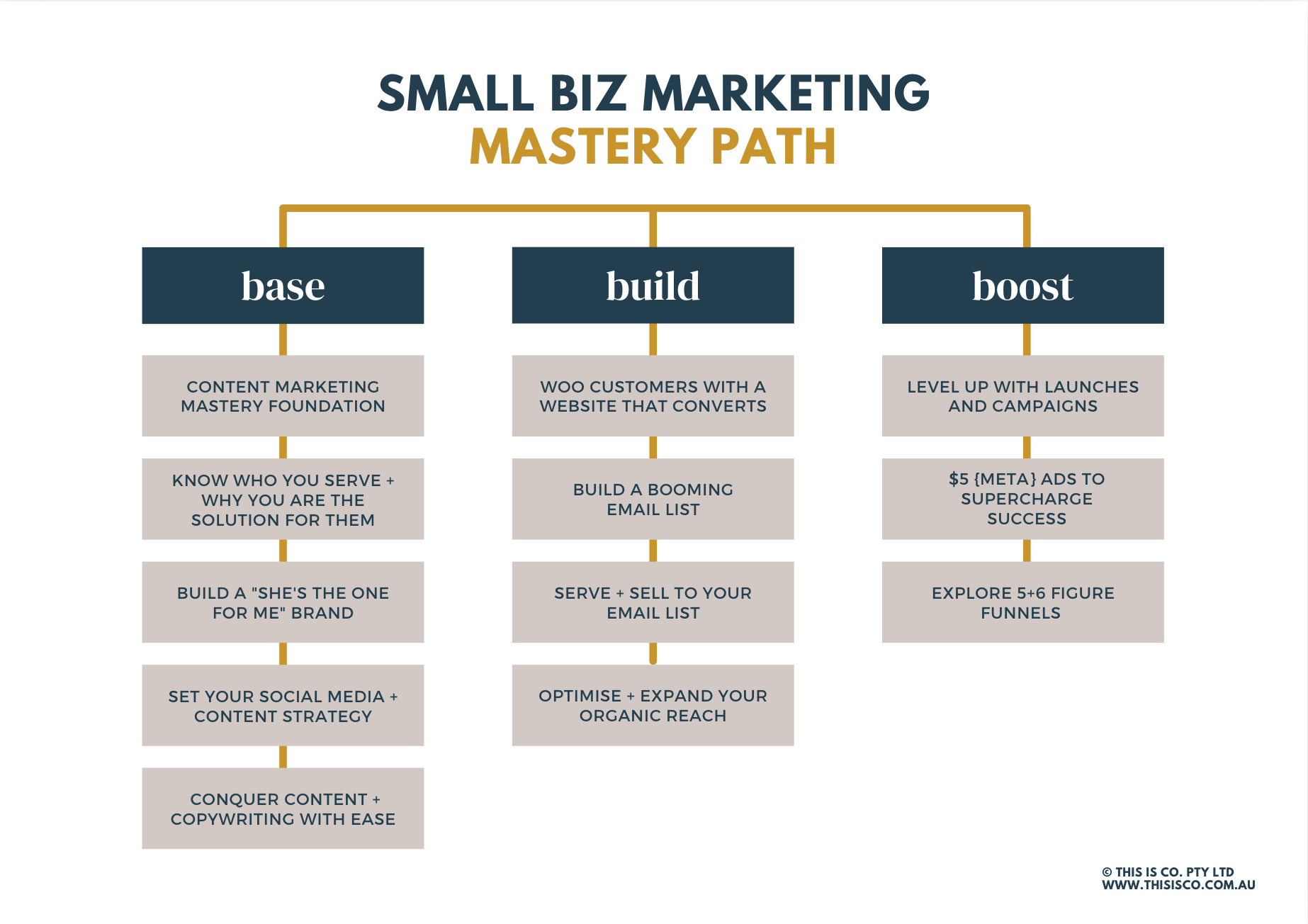 An end-to-end 12-step marketing mastery pathway YOU DO AT A PACE THAT SUITS YOU 🙌 to show you step-by-step how you build a marketing machine. It is the A-Z of content + online marketing as easy as 1, 2, 3. No overwhelm, overwork or feeling "over it", each video lesson comes with templates, swipe-files and shortcuts to get you growing as easy and quickly as possible.